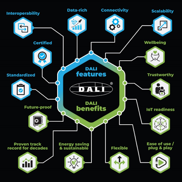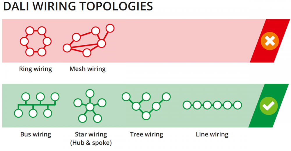 O singură pereche de fire cuprinde magistrala utilizată pentru comunicații într-o rețea DALI. Rețeaua poate fi aranjată în topologie magistrală sau stea sau o combinație a acestora. Fiecare dispozitiv dintr-o rețea DALI poate fi adresat individual, spre deosebire de dispozitivele DSI și 0–10V. În consecință, rețelele DALI folosesc de obicei mai puține fire decât sistemele DSI sau 0–10V.